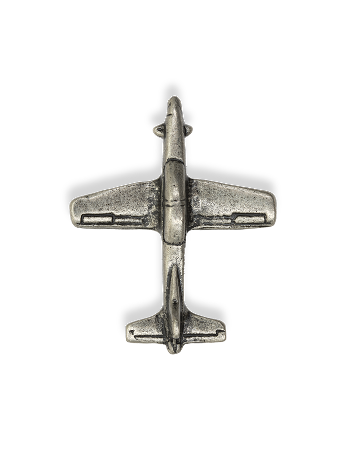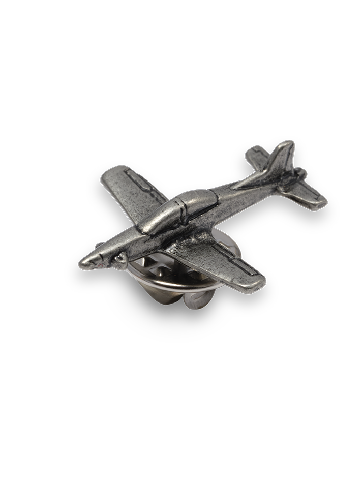 PC-21 Anstecknadel aus Feinzinn in antik Silber. Der Pin ist handpoliert und mit einem Sicherheitsverschluss in einer Kartonbox mit Pilatus Logo-Aufdruck verpackt.
