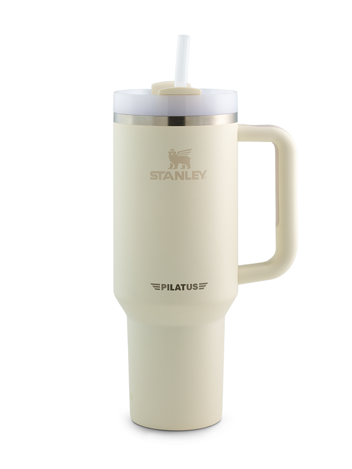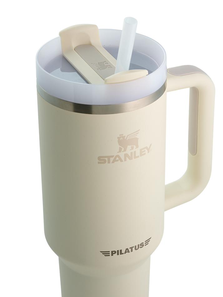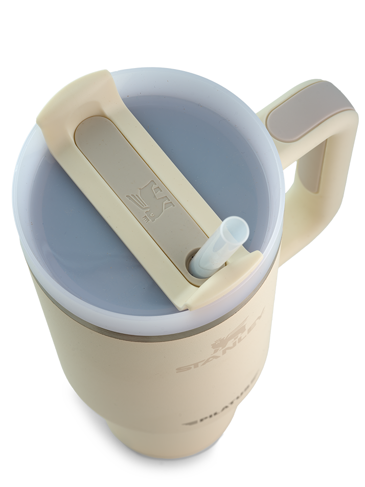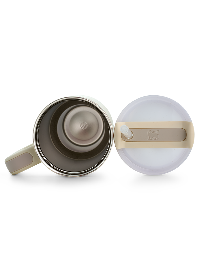 Doppelwandiger, vakuumisolierter Becher aus 90 % rezykliertem Edelstahl, mit ergonomischem Griff, wiederverwendbarem Trinkhalm und einem Schraubdeckel mit rotierender Abdeckung. Er hält Getränke bis zu 11 Stunden kalt und bis zu 7 Stunden warm.