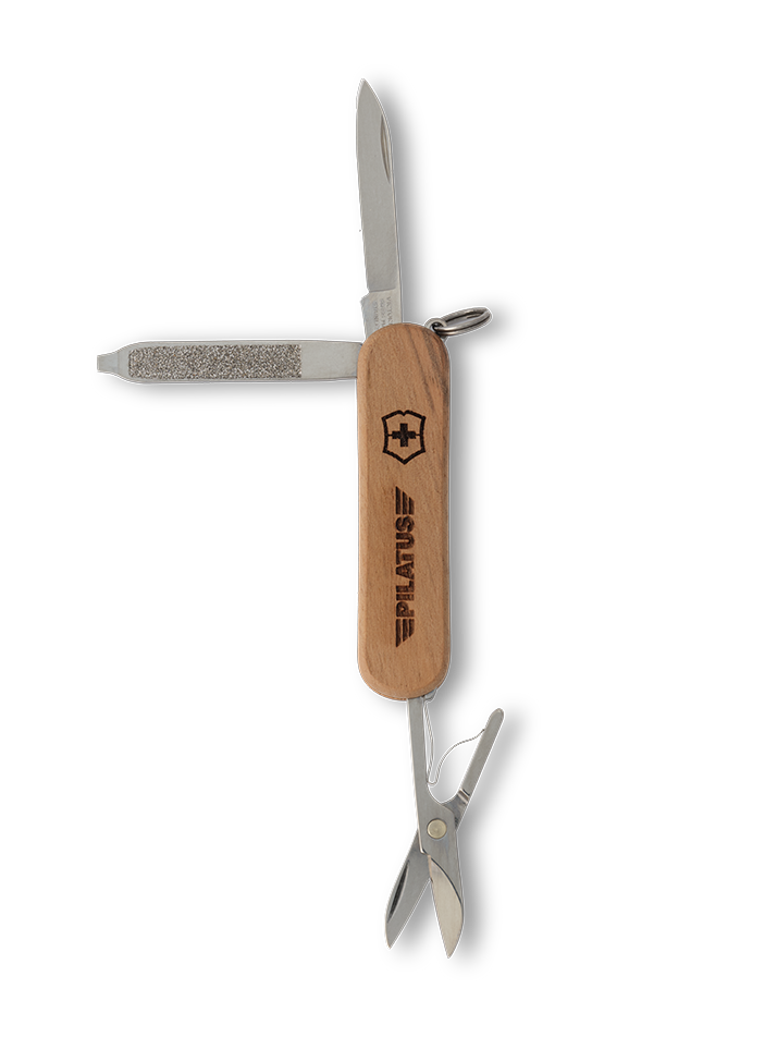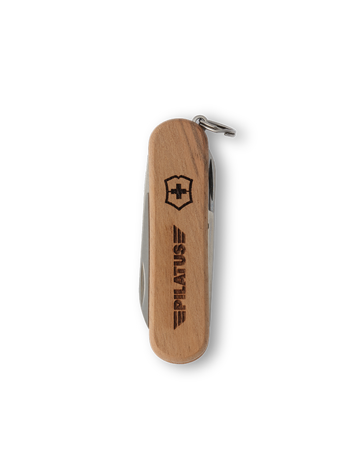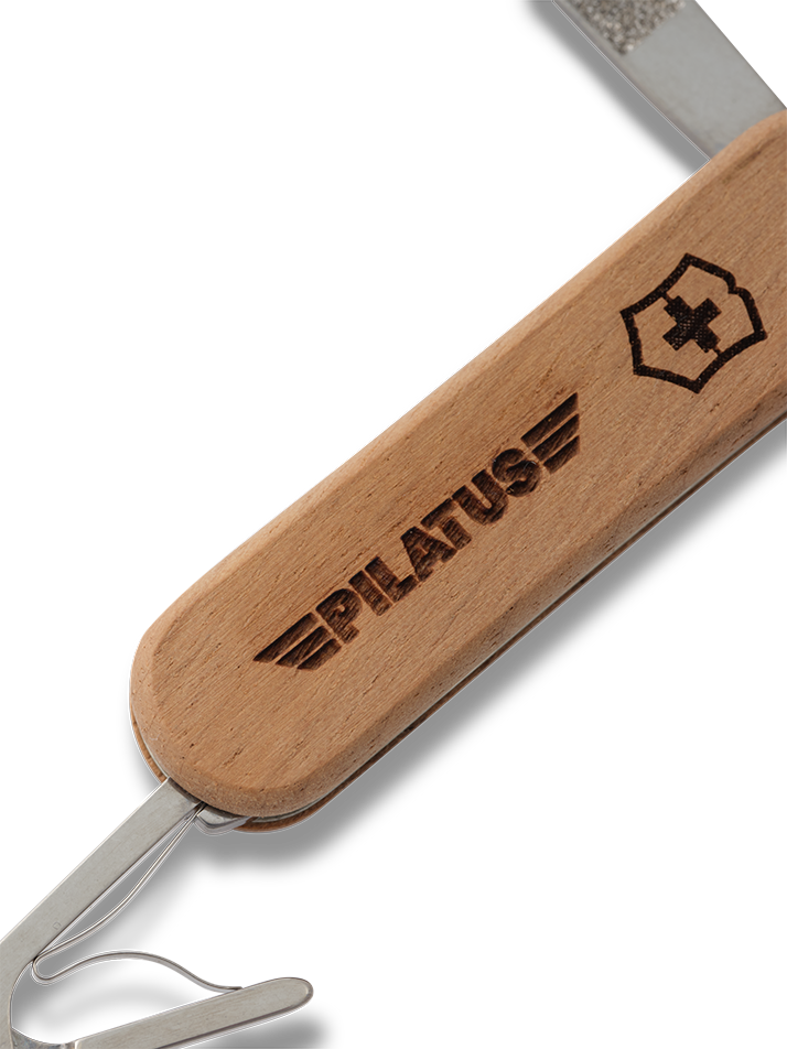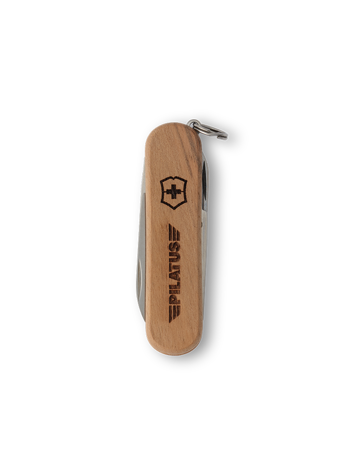 Hochwertiges Schweizer Mini Taschenmesser mit einem Griff aus Nussbaumholz. Zudem ist das Pilatus Logo auf dem Holzgriff eingraviert. Holz ist ein Naturprodukt und kann Unterschiede bei Materialbeschaffenheit, Farbe und Gravur aufweisen.