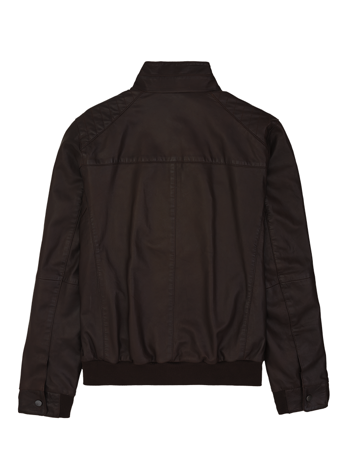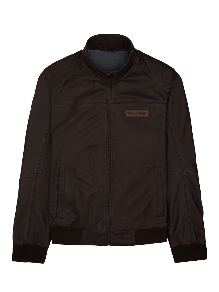 Eine edle Herrenjacke aus Lammnapa. Sie hat einen durchgehenden Reissverschluss, zwei Seitentaschen, einen Stehkragen, ein Bördchen an den Ärmelenden und am Bund. Auf der linken Brust befindet sich ein Pilatus Lederbadge.