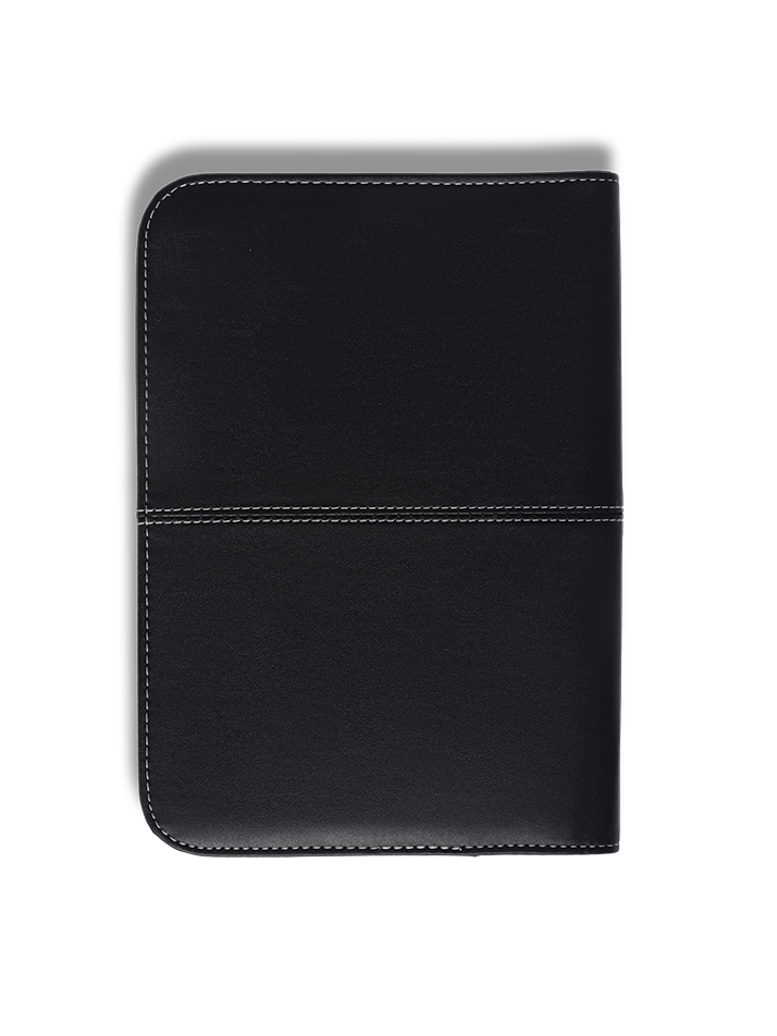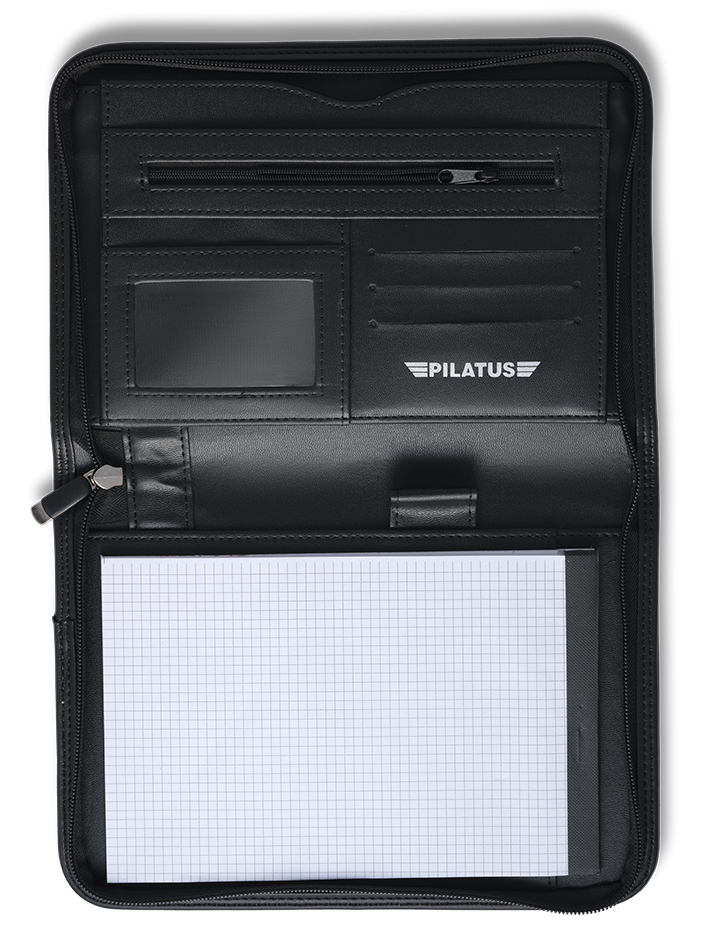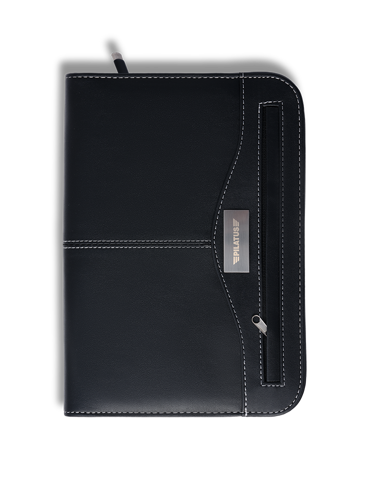 An A5 format writing case made from fine, leather-like material. With pockets for a writing pad, pen and business cards. With Pilatus logo on the outside on a metal plate.