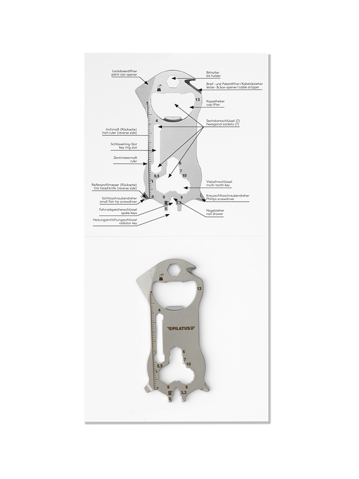 RICHARTZ Key Tool Work is equipped with 21 useful functions including heater vent key, bit holder and package opener. The Key Tool Work is made of high-quality matt-blasted stainless steel.
