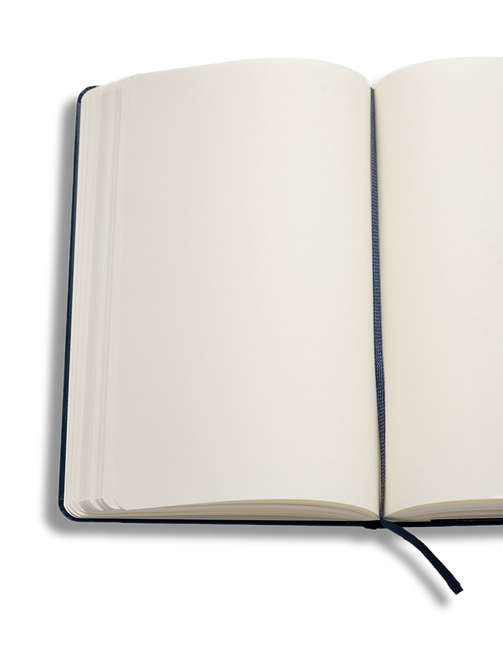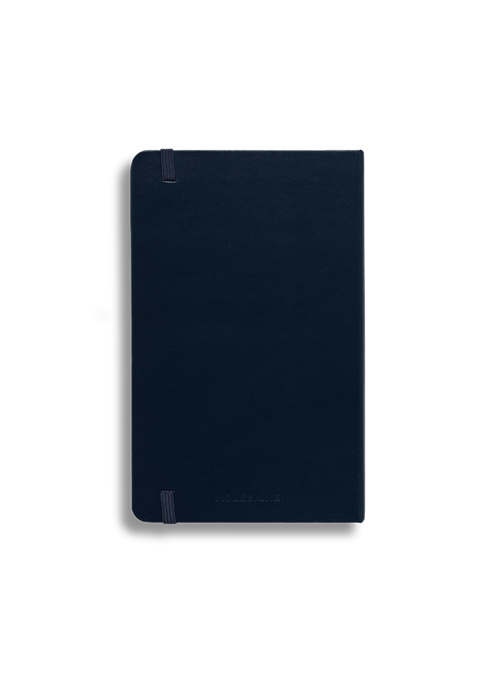 This notebook with a cardboard bound cover and rounded corners has an acid free paper, bookmark ribbon and elastic closure. It has space for a "if lost" note on the first page and an expandable inside pocket on the back, for loose notes and notes. On the inside pocket is the history of Moleskine.