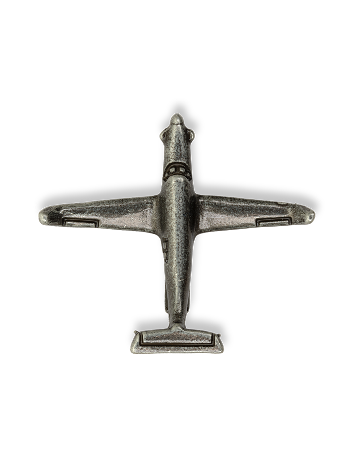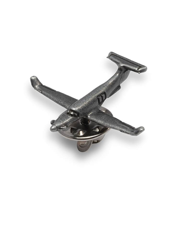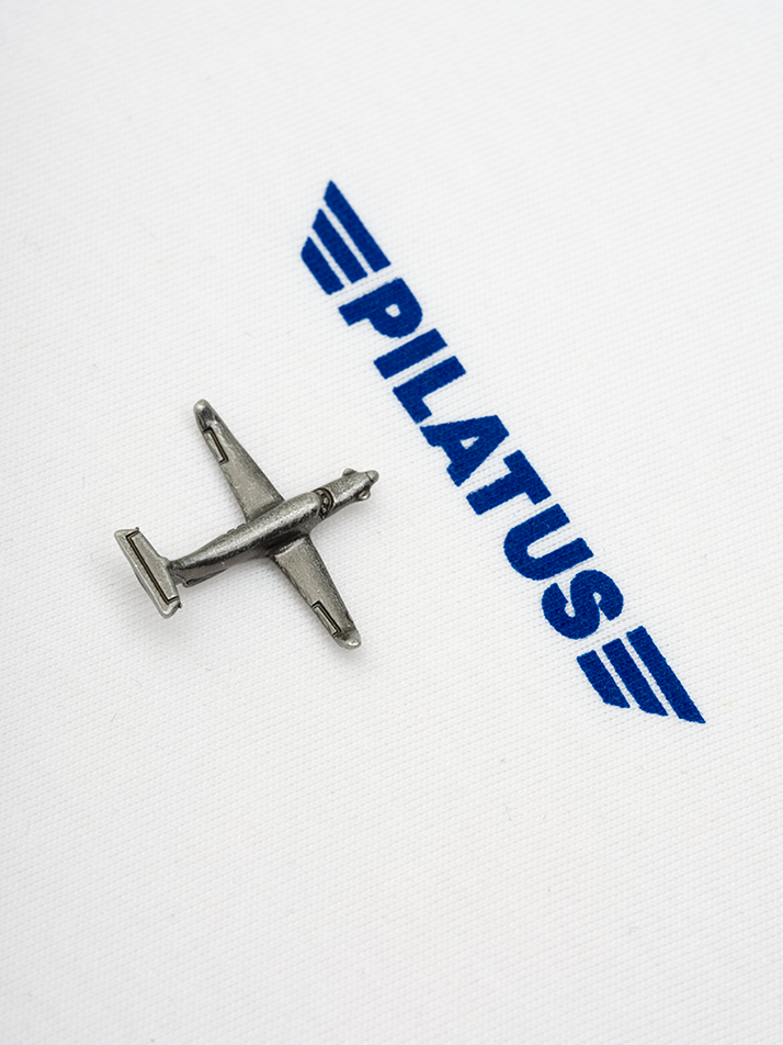 PC-12 pin made of pewter in antique silver. The pin is hand-polished and packaged with a safety clasp in a cardboard box with Pilatus logo imprint.