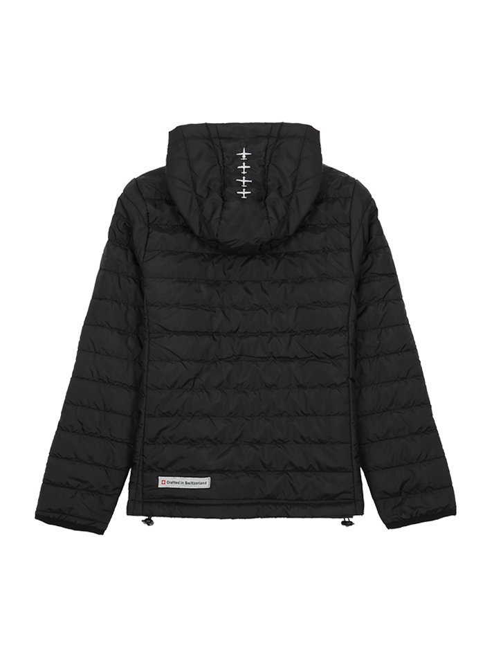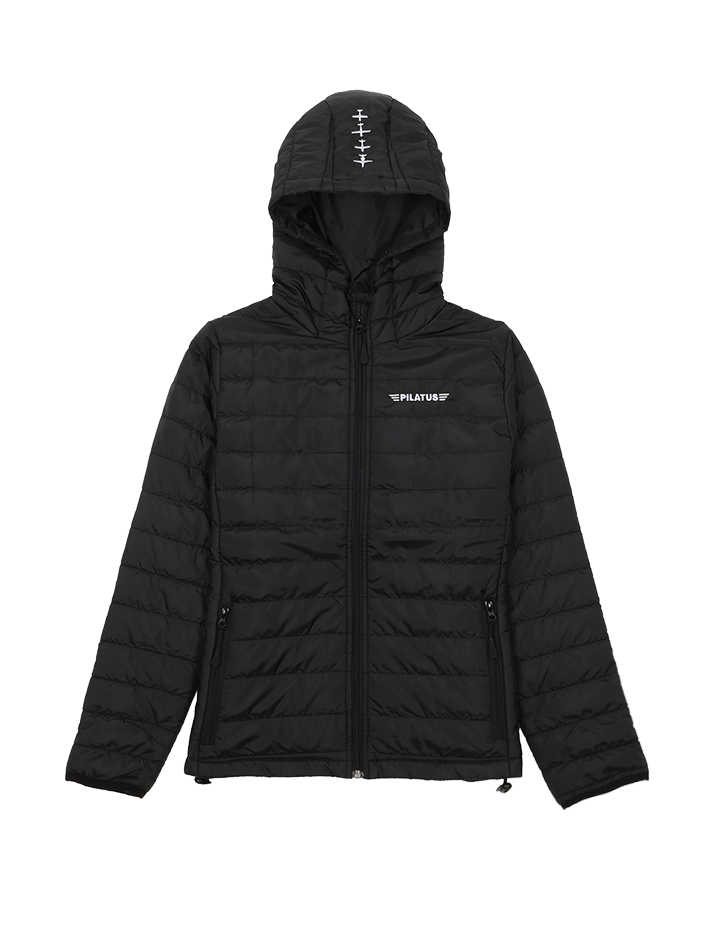 Quilted jacket with hood and full-length zip, 2 side pockets with zip. Elasticated drawstring with stopper at hood and hem.