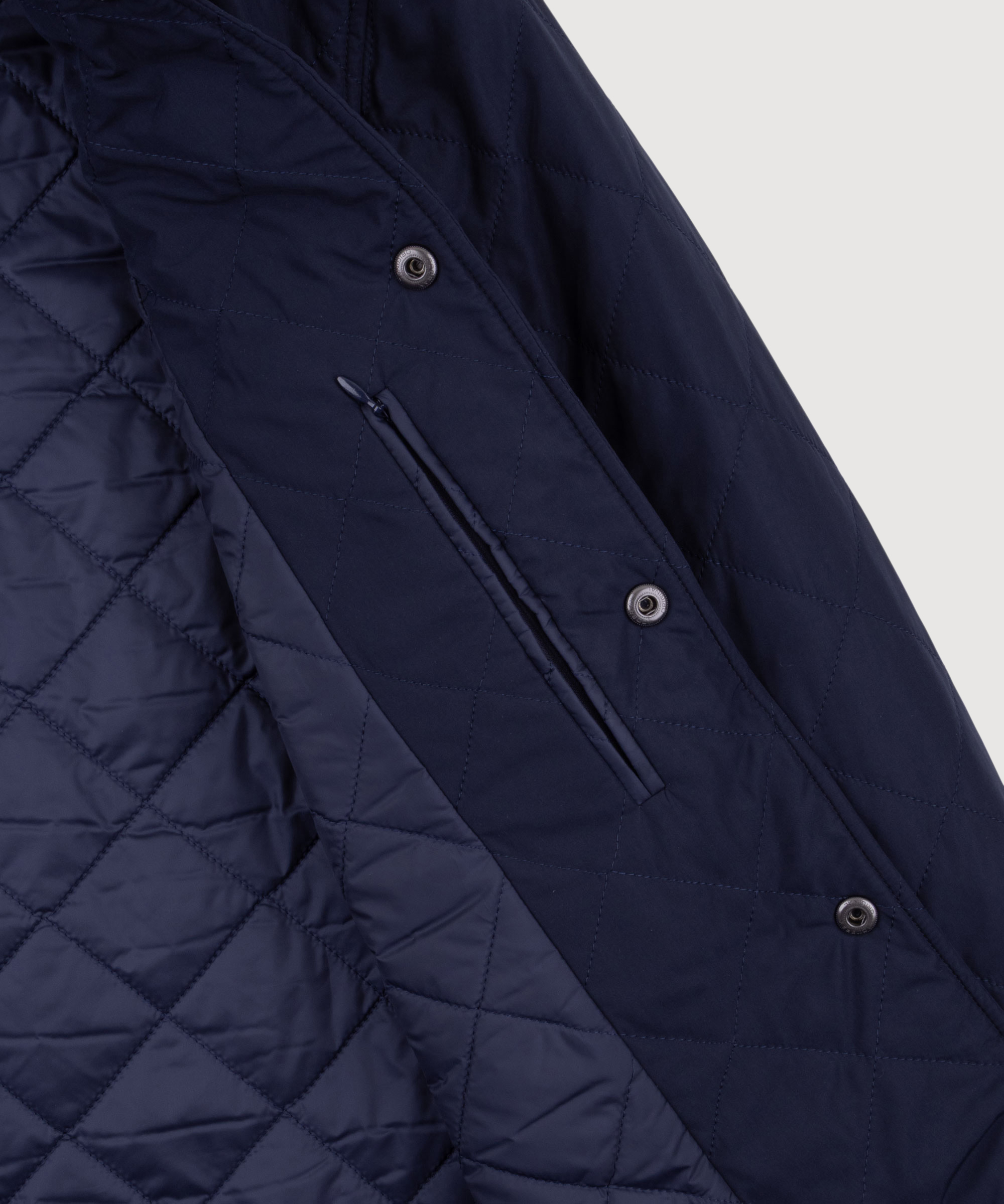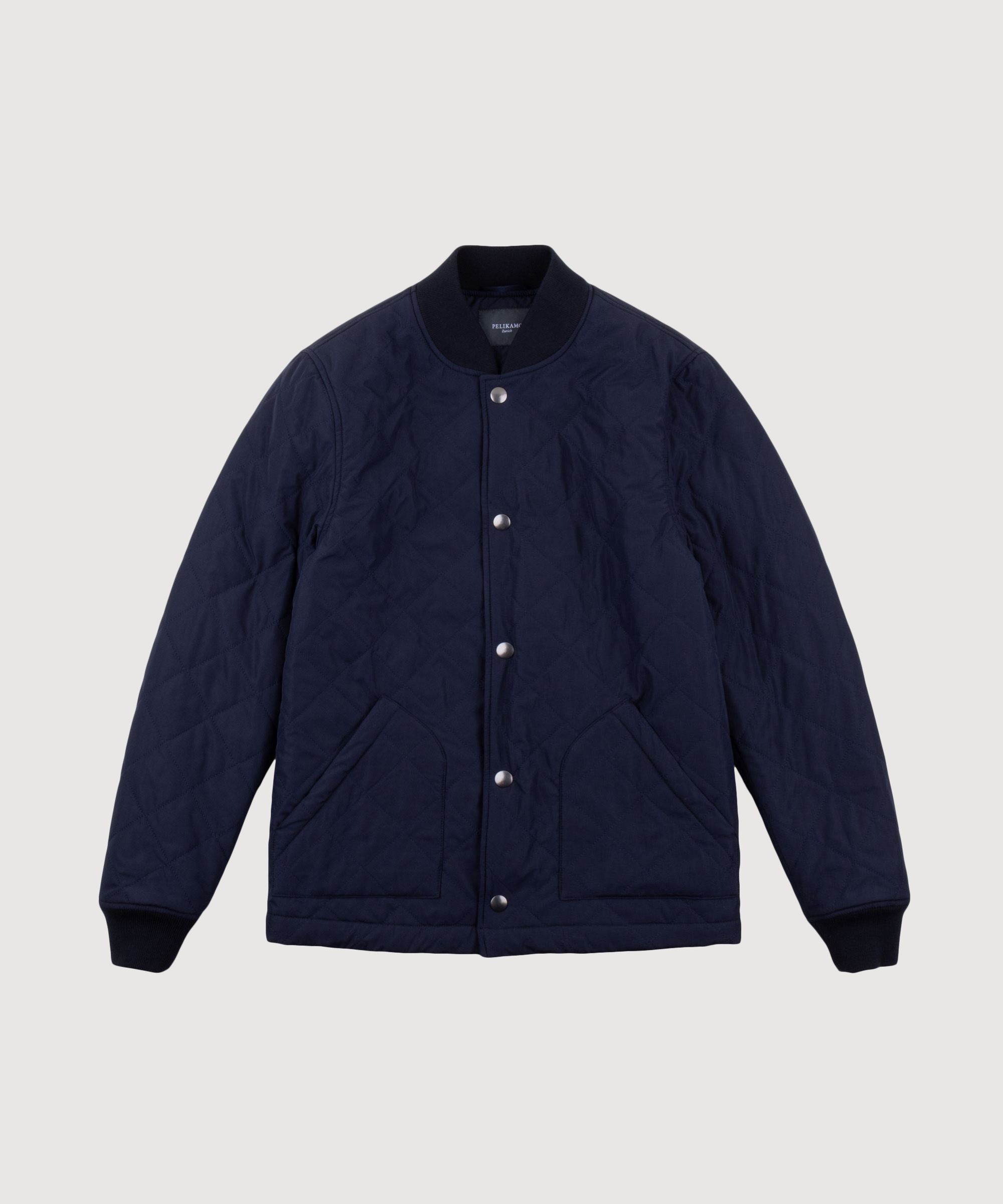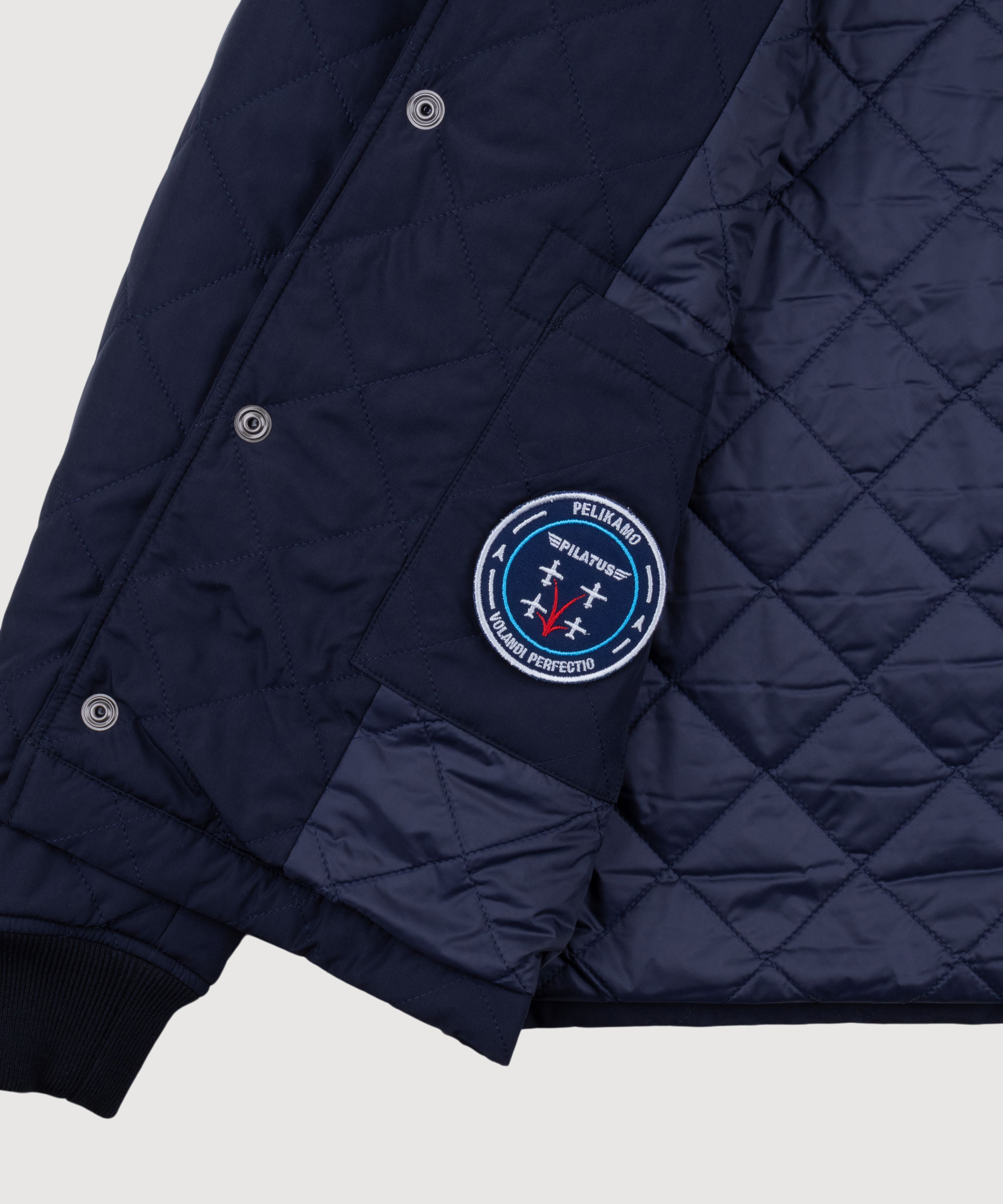 Navy bomber jacket from our exclusive capsule collection with Pilatus Aircraft Ltd, inspired by classic 1950s flight jackets. Including quilted diamond-pattern lining, removable Velcro patch, ribbed cuffs and hem and technical Italian fabric with lightweight eco-padding.